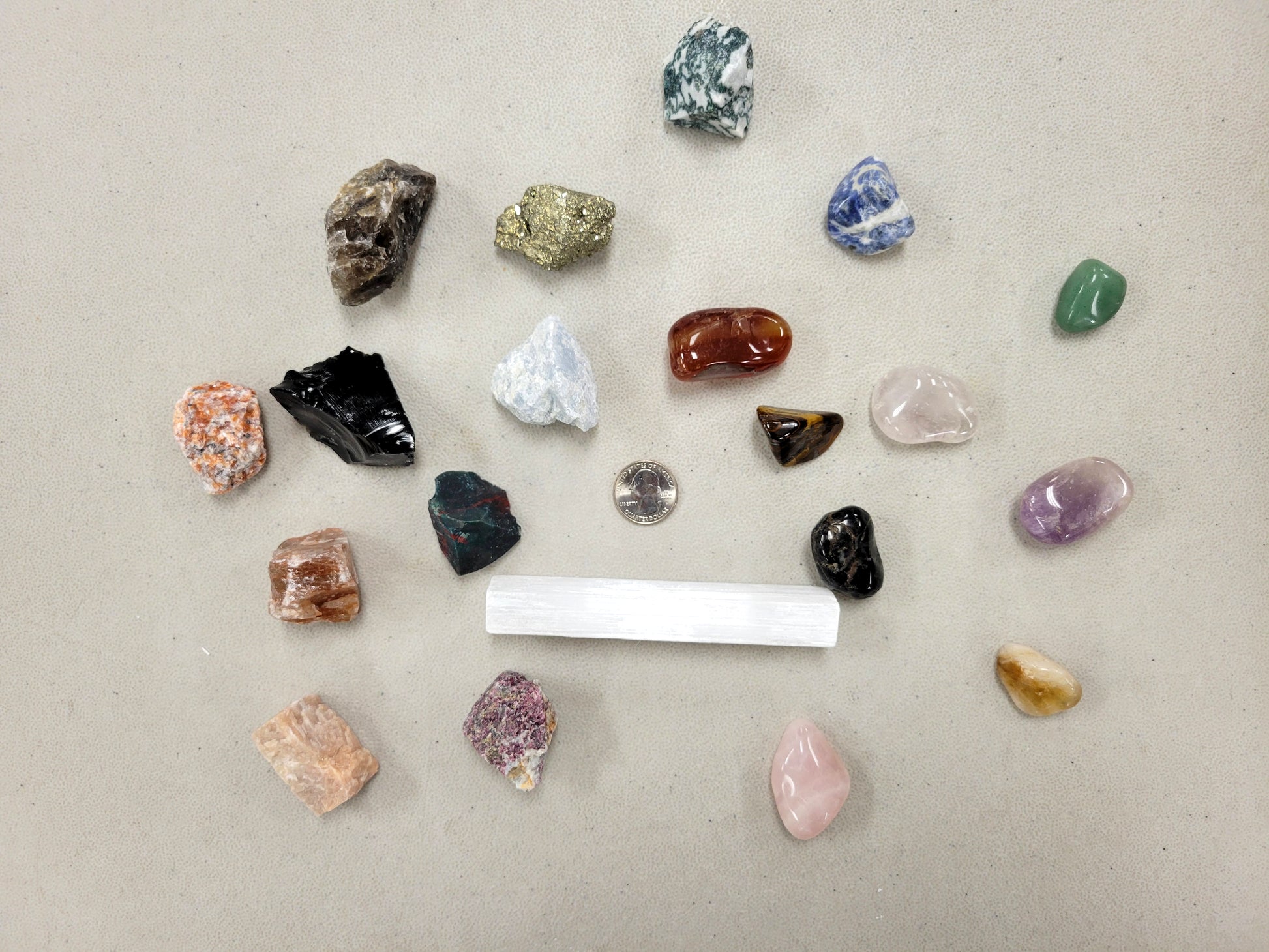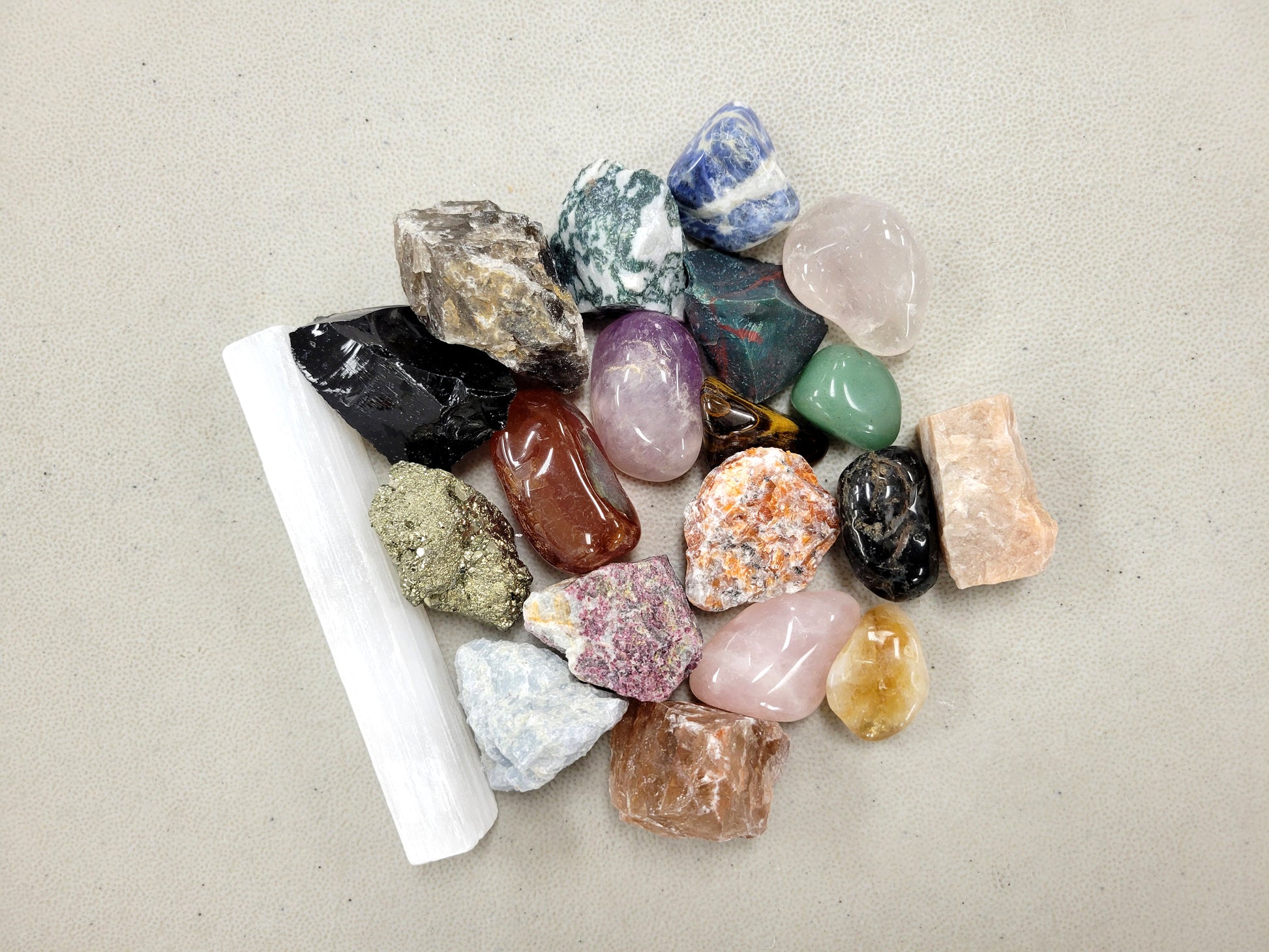 This is a set of 20 different raw and tumbled crystals. The crystals in this collection are all different in shapes and sizes. This collection is a perfect starter set to give as gift to yourself or to a friend.