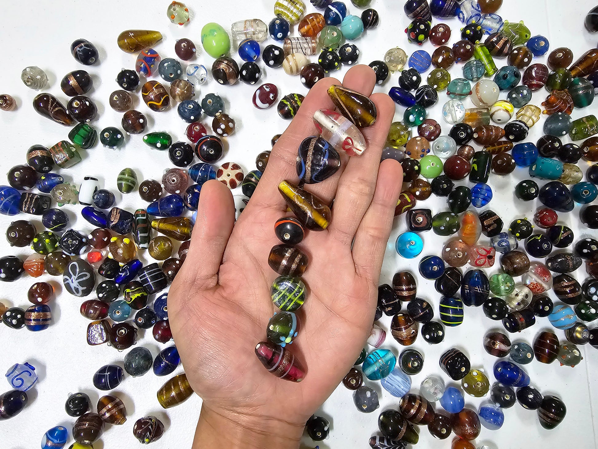 These assorted mix of loose glass beads are from India and we are selling these by weight so you get a lot for the price. So many whimsical and cute designs! Hole size is around 0.5 to 1.5 MM.
