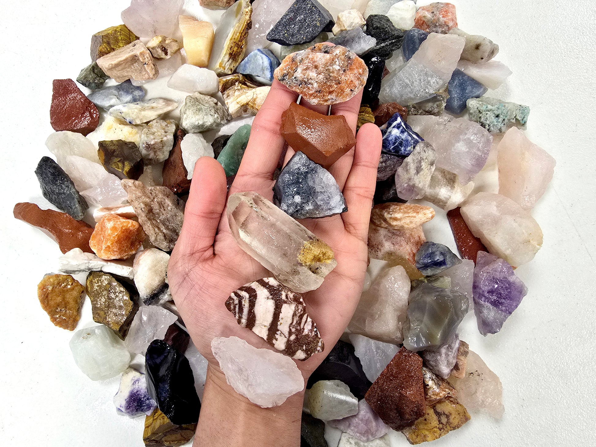 These stones are hand-picked and sorted from Brazil, a region well-known for its wide variety of mineral deposits. The mix may include quartz varieties, calcite, jasper, agate, feldspar, and other natural stones depending on availability.