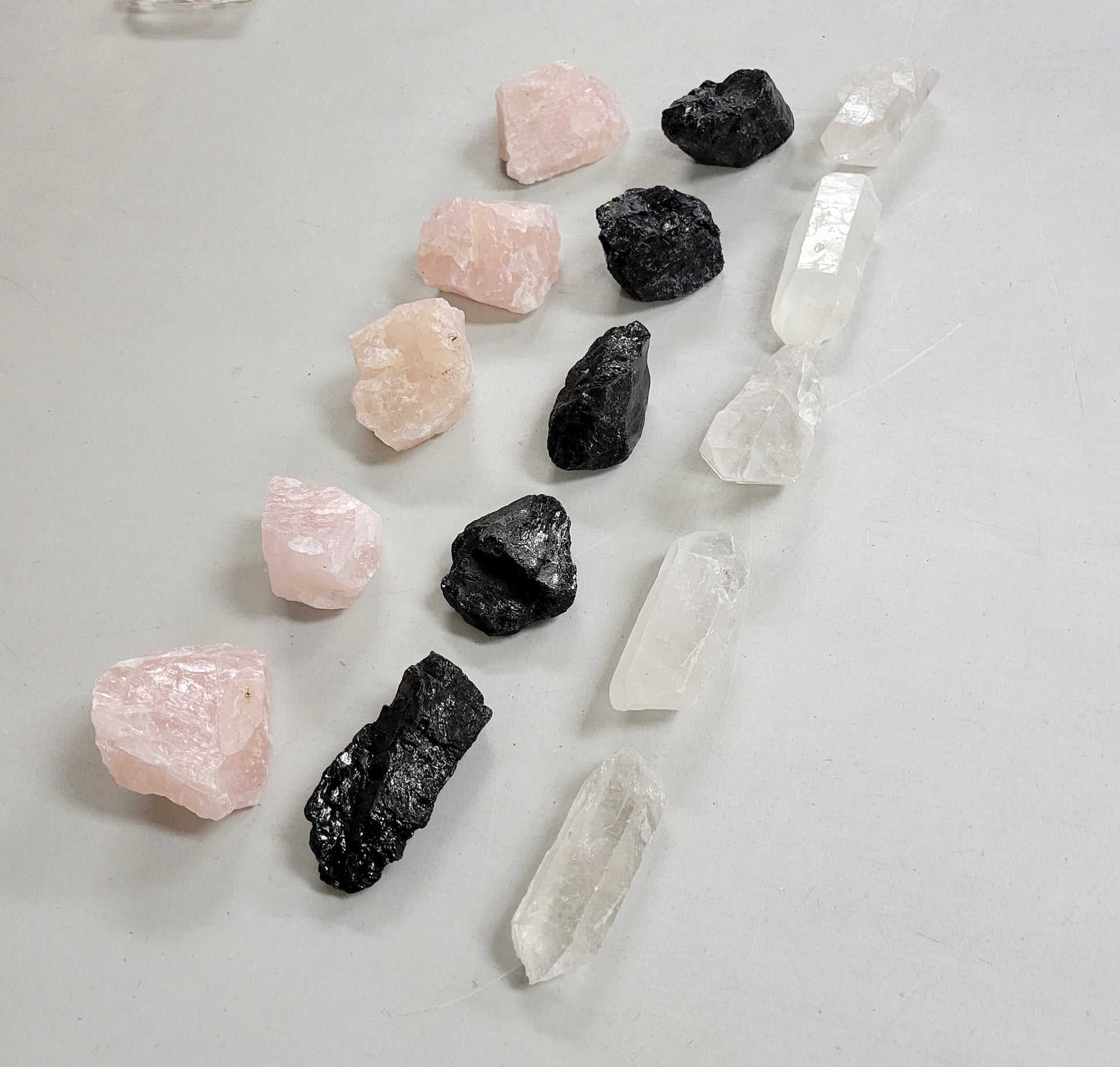 This is for 3 pieces of Crystals: Black Tourmaline, Rose Quartz & Quartz Point. Each stone measures between 1 to 2.5 inches and weighs between 2 to 3 oz.