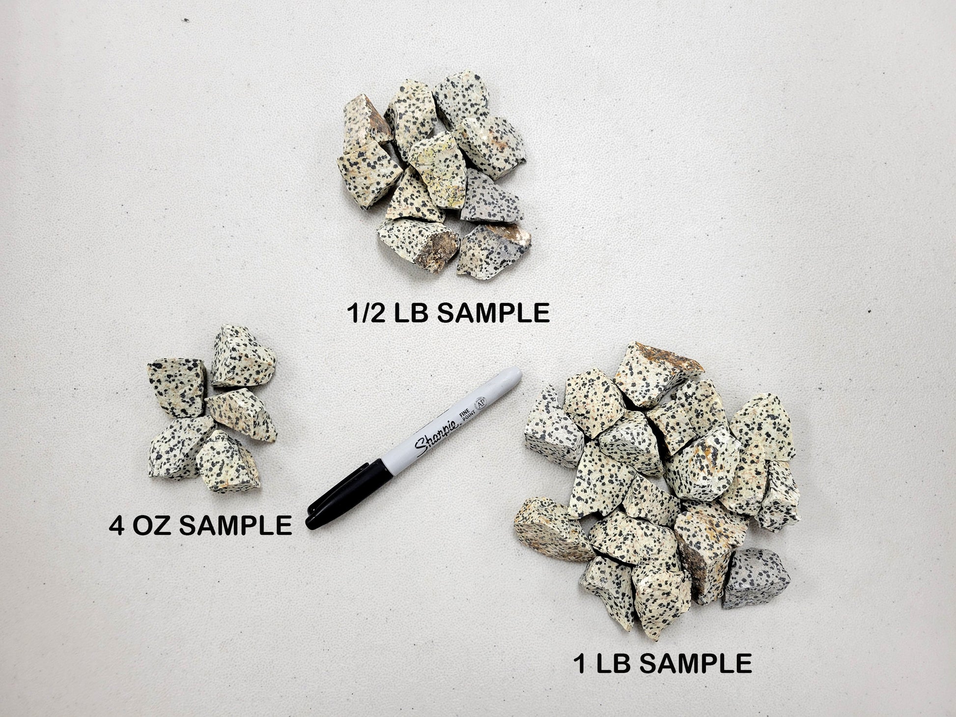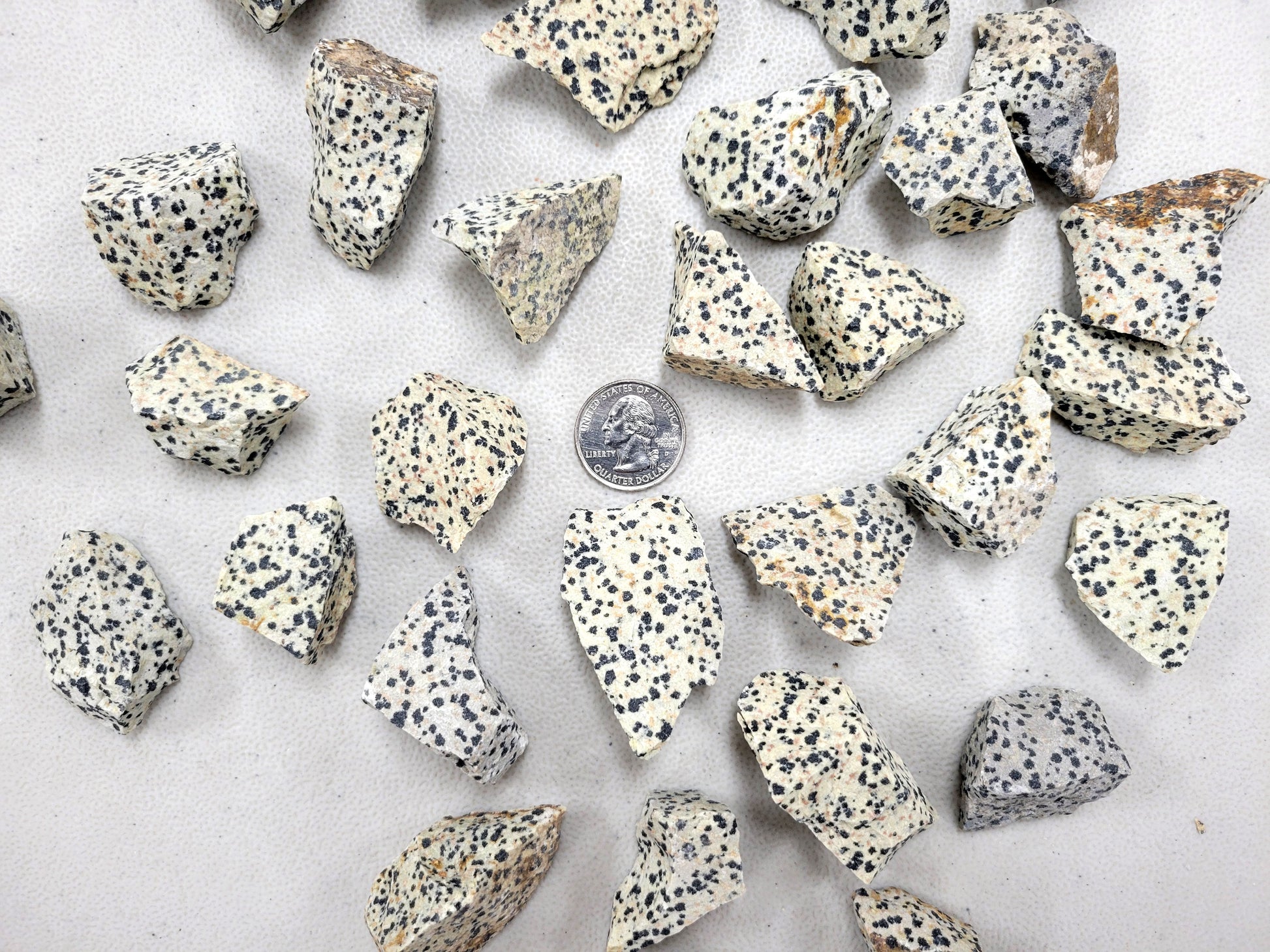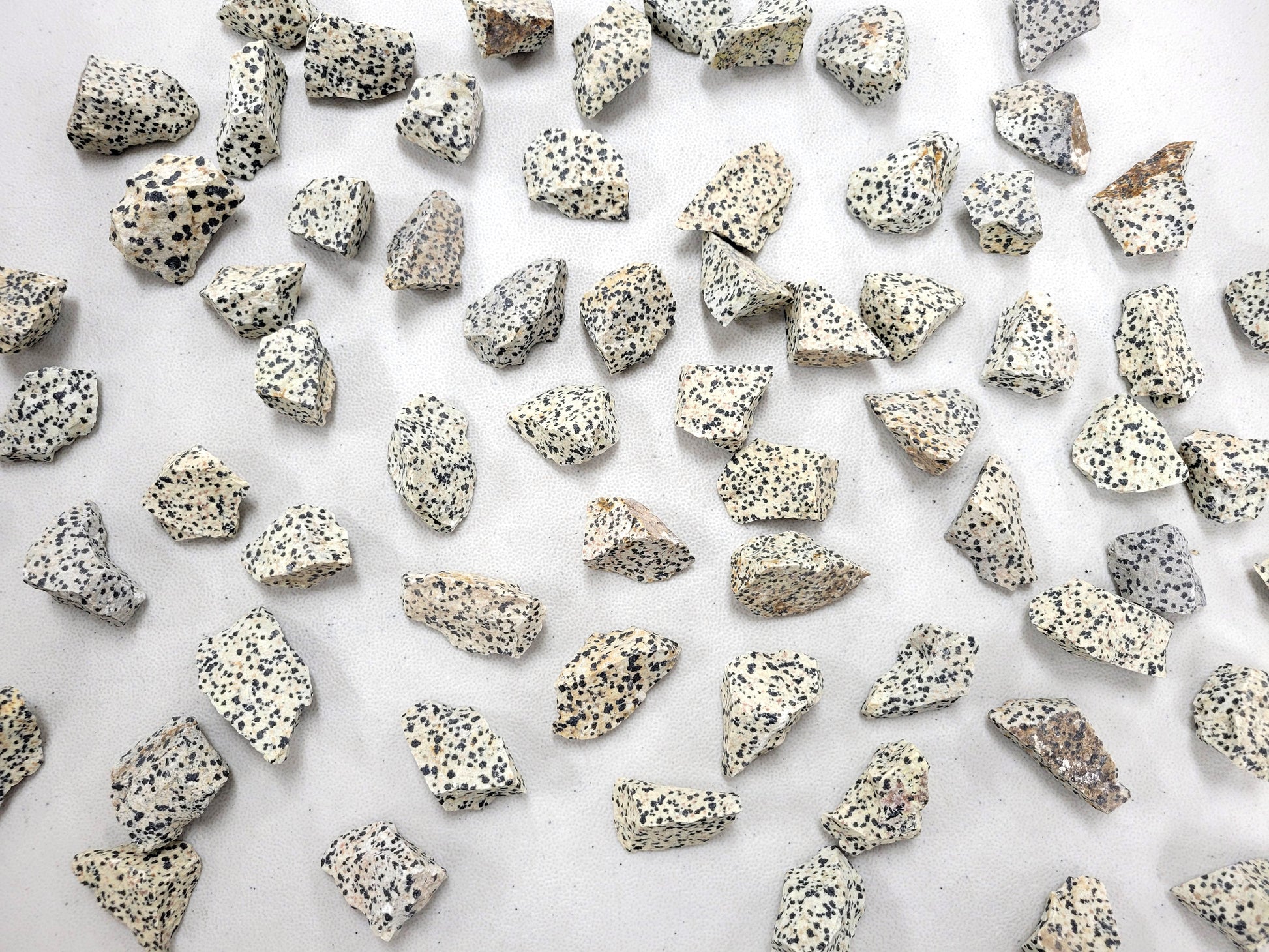 These are raw pieces of Dalmatian Jasper stones from Mexico. Each piece measures between 3/4 inch to 2 inches.