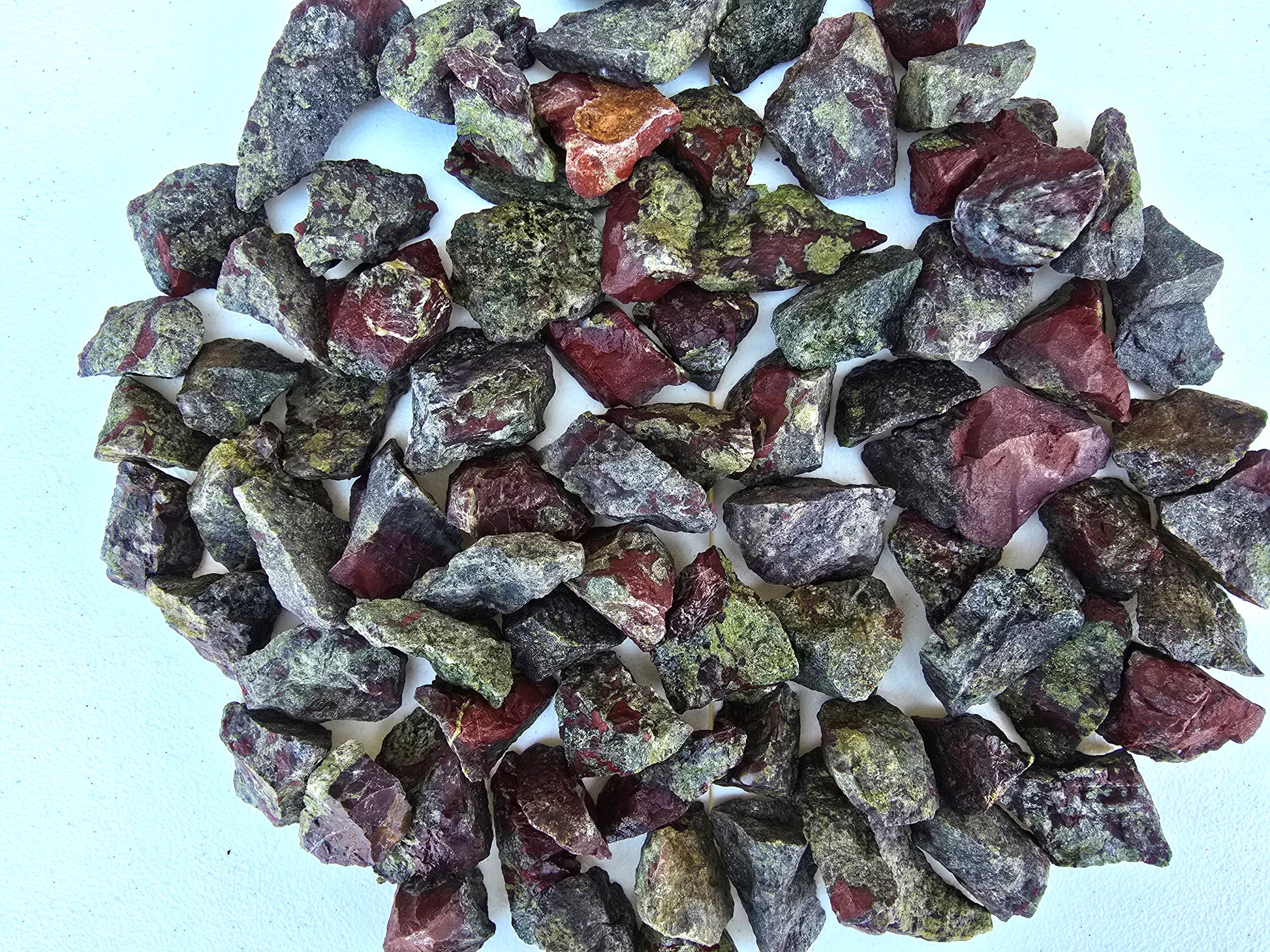 Each stone measures approximately 3/4 inch to 2 inches, making them a perfect size for crystal grids, meditation, reiki, rock tumbling or simply as a unique addition to any rock collection. Dragon Stone AKA Dragon Bloodstone or Blood Jasper is a combination of green Epidote and red Piemontite, known for its striking earthy tones and natural texture.