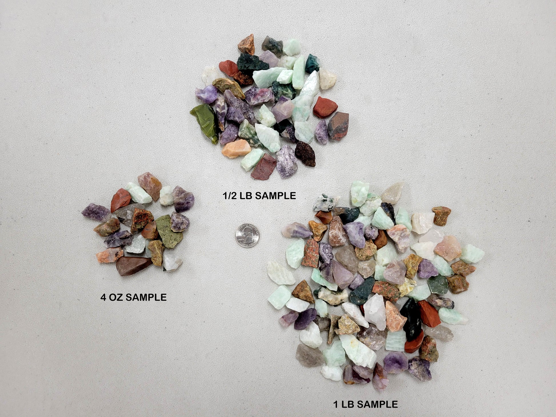 This a mix of crushed raw crystals from India. Each piece measures between 1/4 inch to 3/4 inch.