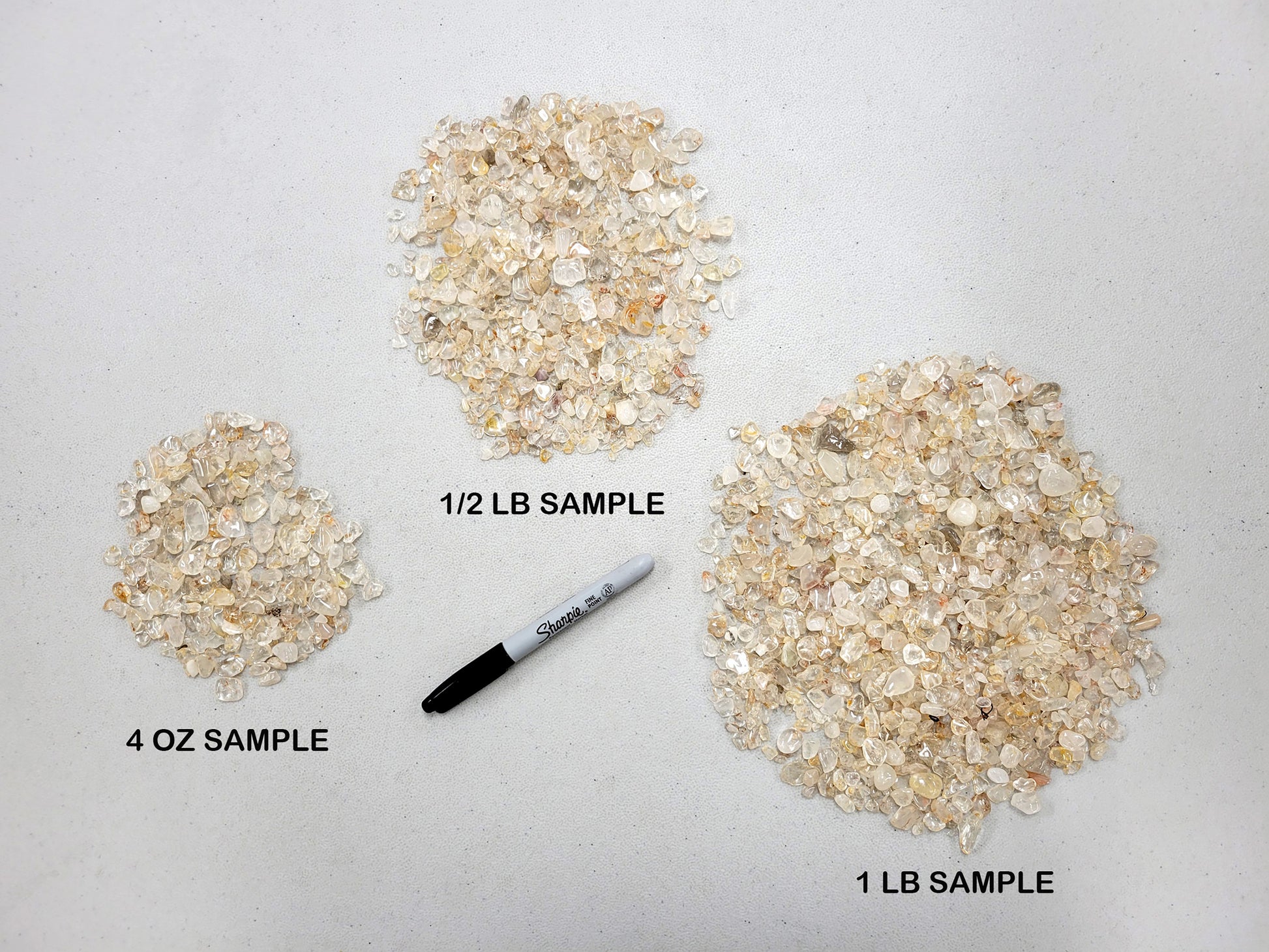 These are tumbled Clear Quartz crystal chips from Brazil. Each piece averages about 5-10 MM in size with some bigger or smaller pieces in the mix.